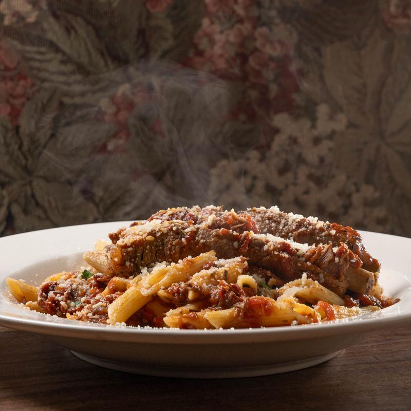 My nonna always had a pot full of tomatoes, pork ribs, stewed beef, and pepperoni simmering on the back of the stove; we serve her original sauce recipe over penne.